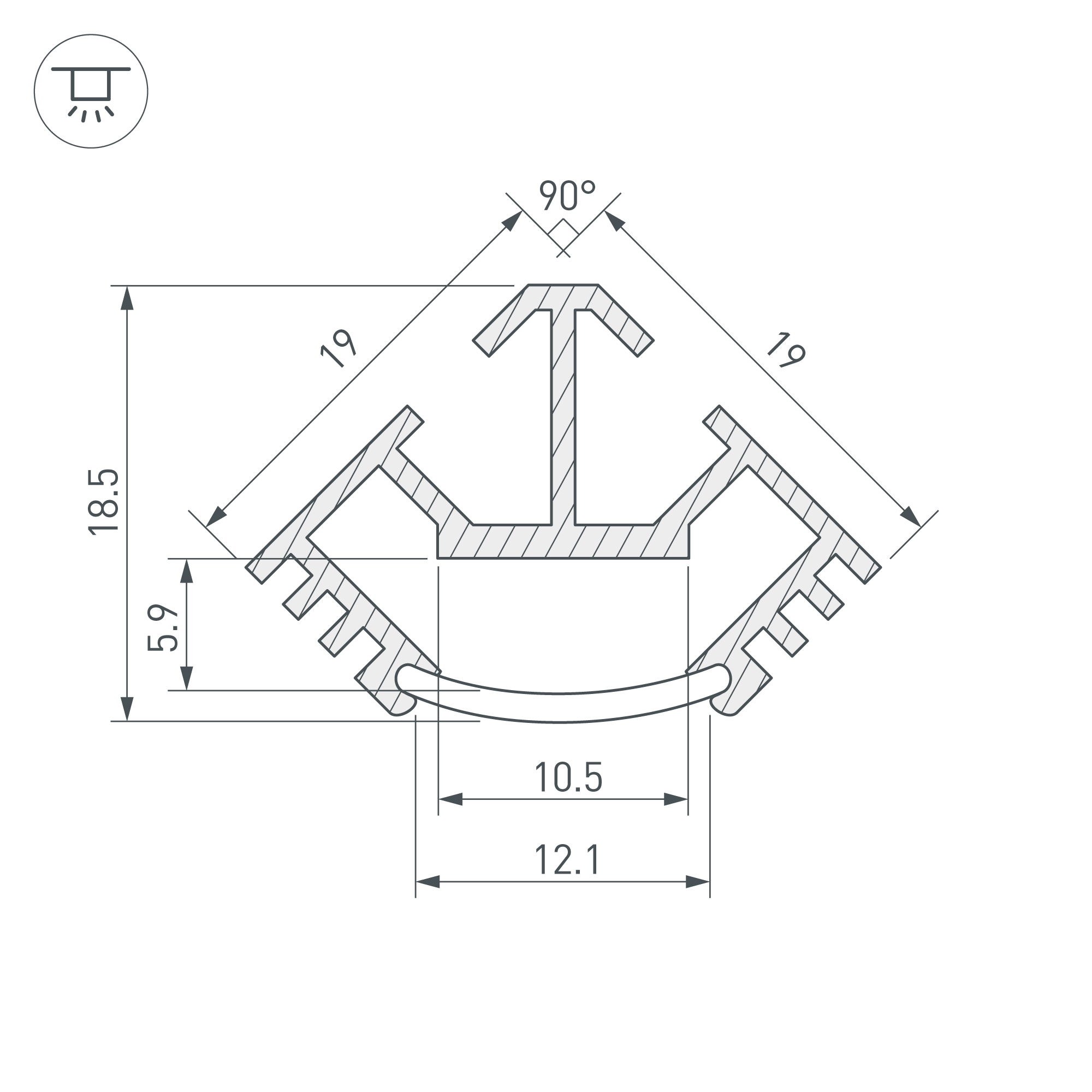 Алюминиевый угловой профиль для светодиодных лент и линеек. Габаритные размеры (L×W×H): 2000x19x19 мм. Ширина площадки для ленты 10,5 мм. Экраны, заглушки и другие аксессуары приобретаются отдельно. Цена за 1 метр.
