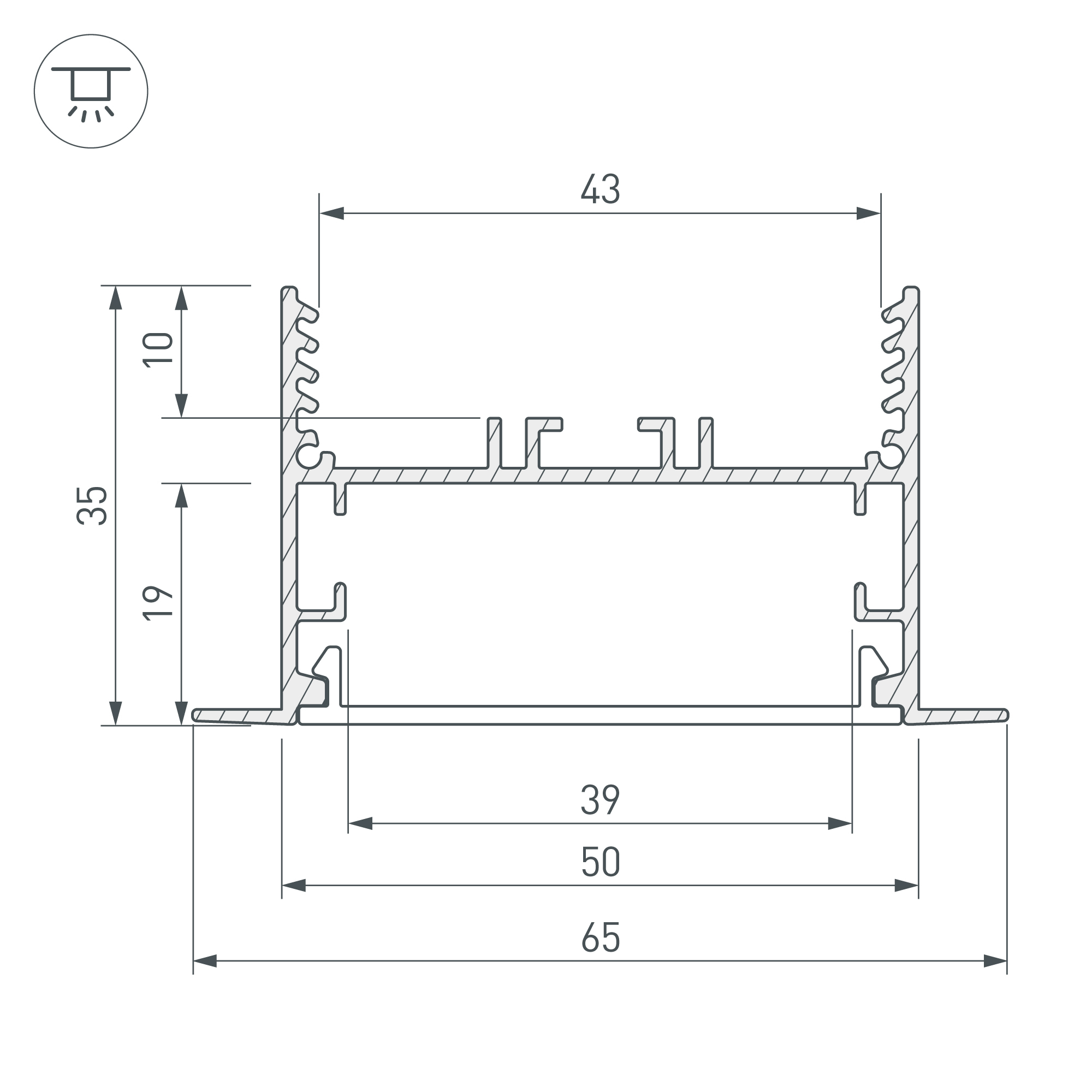 Алюминиевый анодированный профиль для светодиодных лент и линеек. Габаритные размеры (L×W×H): 2000x65x35 мм. Ширина площадки для ленты 38 мм, паз для установки 50 мм. Экраны, заглушки и другие аксессуары приобретаются отдельно. Цена за 1 метр.