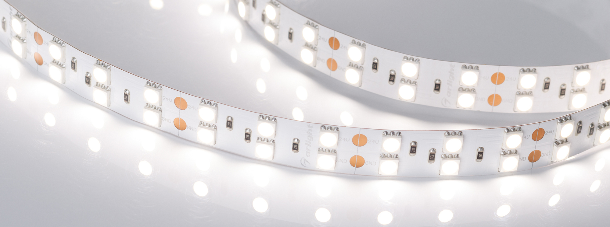 Широкая двухрядная светодиодная лента LUX шириной 15 мм. Светодиоды SMD 5060 (120 шт/м) с дневным белым цветом свечения (3800–4200 К). Мощность 28.8 Вт/м, напряжение питания 24 В. Минимальный отрезок 50 мм (6 светодиодов). Декоративная подсветка интерьера, потолочных ниш, рабочих зон кухни, мебели. Подсветка рекламных конструкций и витрин. Обязательна установка на профиль.